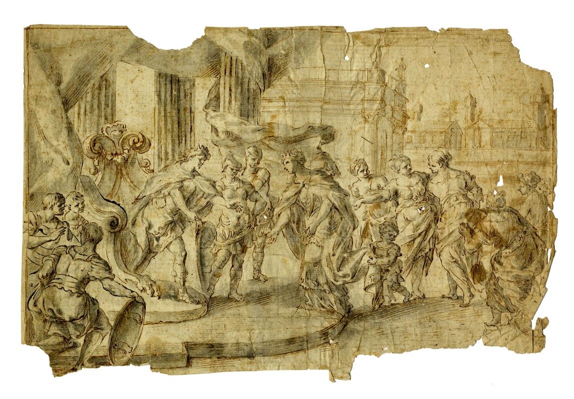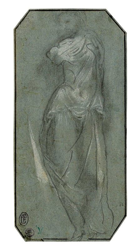 Penna e inchiostro bruno, pennello e acquerello grigio. Carta vergellata sottile color crema con filigrana non identificabile in cerchio singolo. mm 220x334. Il disegno richiama l'affresco eseguito attorno al 1752 da Sebastiano Conca nella basilica di Santa Chiara a Napoli. SI AGGIUNGONO: Scuola romana XVII secolo. Figura femminile stante con veste panneggiata. Matita nera con rialzi in bianco su foglio ottagonale oblungo in carta vergellata azzurra. Linea d'inquadramento a pennello e inchiostro nero. mm 228x110. In basso a sinistra marchi di collezione Cesare Frigerio (Lugt, 4363), Francesco Dubini (Lugt, 987a), Giorgio Dalla Bella (Lugt, 3774). Al verso notazione inventariale a penna e inchiostro bruno "n°: 615"/ Anonimo XVII secolo. Figura stante loricata (r). Studio per portatrice d'acqua inginocchiata (v). Matita nera su carta vergellata color avorio priva di filigrana (r). Penna e inchiostro bruno (v). mm 236x163. In basso marchio di collezione Giorgio Dalla Bella (Lugt,3774).