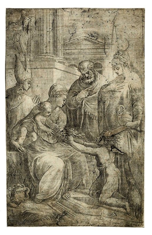 Acquaforte e puntasecca. mm 345x218. Bartsch, XVI, 64. Bertelà/Ferrara (bolognesi ed emiliani del '500), 276. Bella prova nel III e definitivo stato con fratture e ossidazioni della lastra, su carta vergellata sottile con filigrana "corona sormontata da trifoglio, stella e mezzaluna" (simile a Woodward, 267-268. Venezia, 1561-1570).