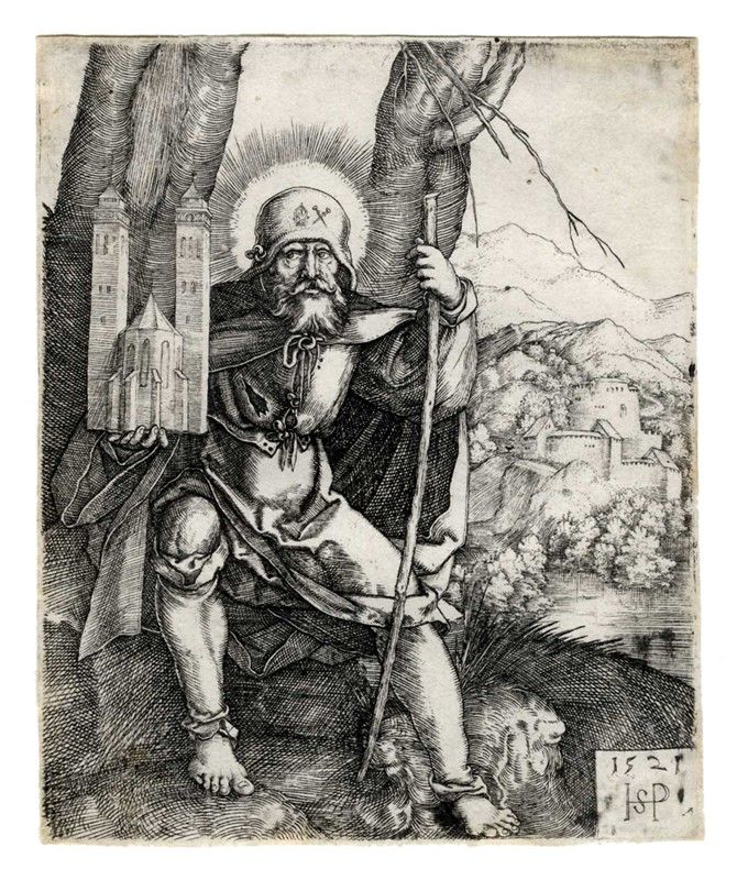 Bulino. mm 120x101. Bartsch, VIII, 65. Hollstein, 69. Con il monogramma e la data "1521" nella tabella in basso a destra. Il santo eremita e patrono di Norimberga è raffigurato con la veste da pellegrino mentre sorregge nella mano destra il modello della chiesa a lui consacrata. Ottima prova nel II stato di 2 dopo la riduzione della lastra, su sottile carta vergellata apparentemente priva di filigrana.