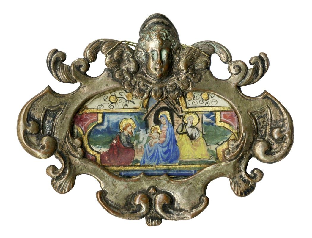 Tempera a colori e pittura oro su foglio di carta ovale. mm 48x80. Santo genuflesso in adorazione del Bambino nella capanna di Betlemme.