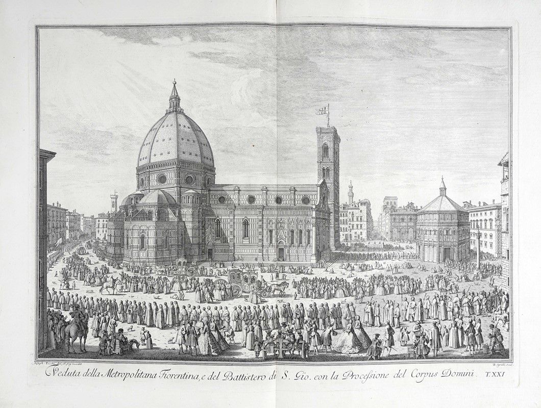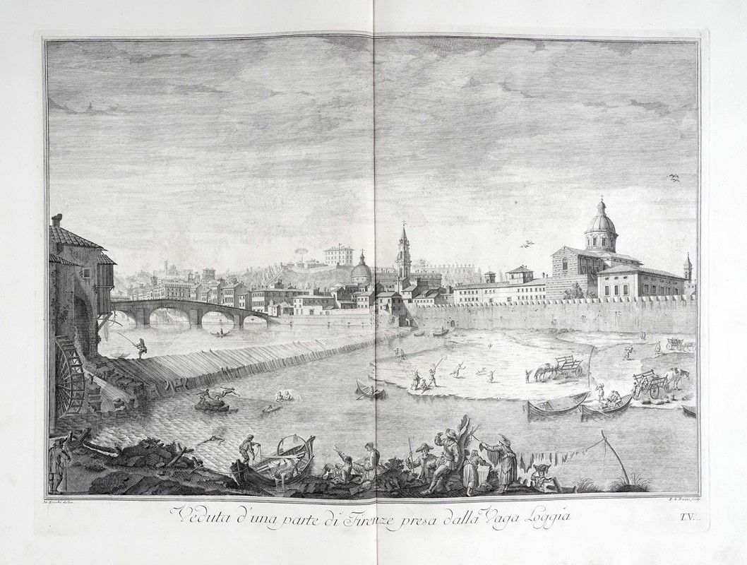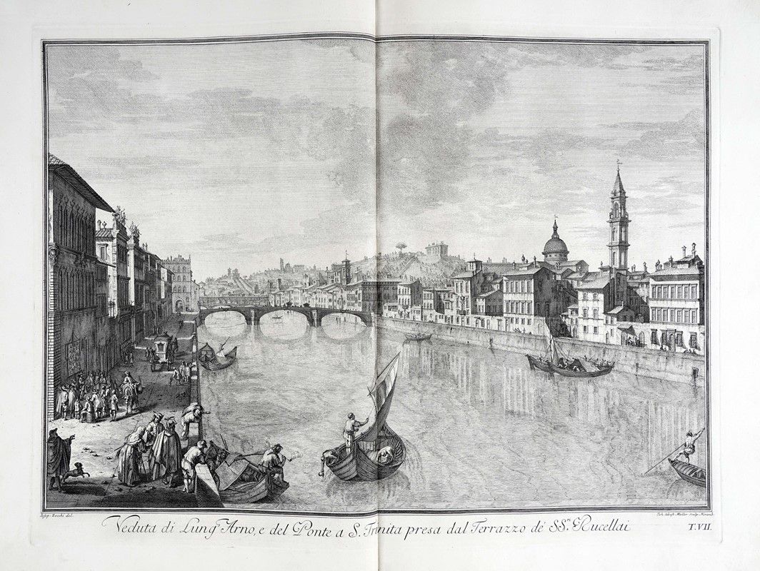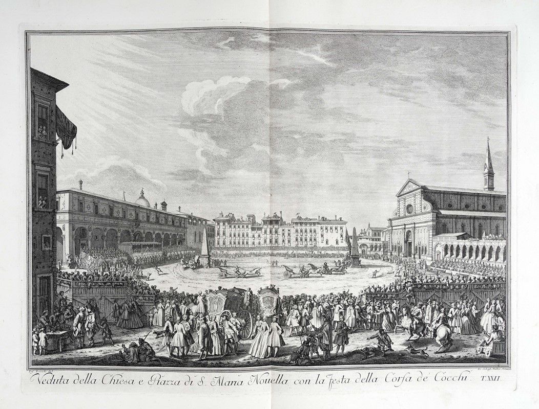 In-folio grande (mm 610x425). II edizione della raccolta commissionata dal Marchese Andrea Gerini comprendente tavole eseguite da alcuni tra i più valenti incisori dell'epoca su disegni di Giuseppe Zocchi, ed edita per la prima volta a cura di Giuseppe Allegrini nel 1744. Frontespizio a doppia pagina con Dedica a Maria Teresa d'Austria incisa da Filippo Morghen, Pianta della città di Firenze nelle sue vere misure...(derivata da quella del 1731 di Ferdinando Ruggeri, con in calce la scritta “Appresso Giuseppe Bouchard in Firenze 1755” e presente solo nella terza edizione pubblicata nel 1757), 24 tavole a doppia pagina incise all'acquaforte con numerazione romana in basso a destra. Bellissima legatura della storica legatoria modenese Apparuti in piena pelle rossa con due cornici concentriche di fregi fitomorfi impresse in oro ai piatti, ferri a motivi fogliati accantonati interni e piccolo rosone centrale; decorazioni, nervature e titoli impressi in oro ai comparti del dorso. Contropiatti con cornice decorata impressa in oro e carta marmorizzata. Al contropiatto posteriore in basso Apparuti Modena. Bellissime impressioni stampate con evidente contrasto e inchiostrazione brillante su carta vergellata pesante.con filigrana lettere P e S visibile sulla quasi totalità dei fogli.