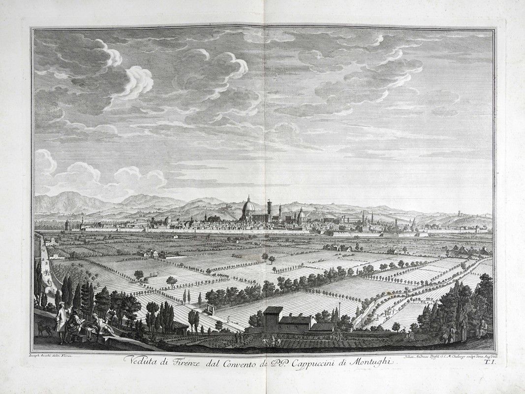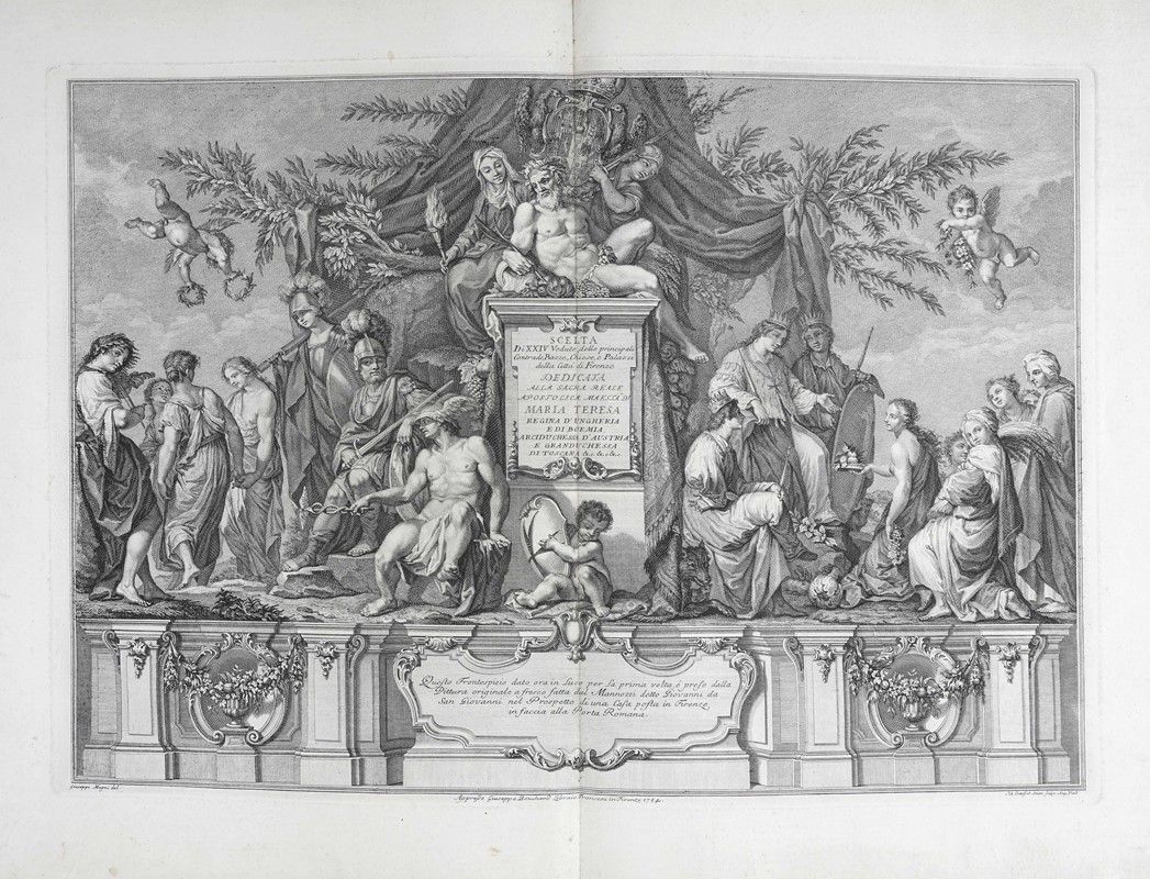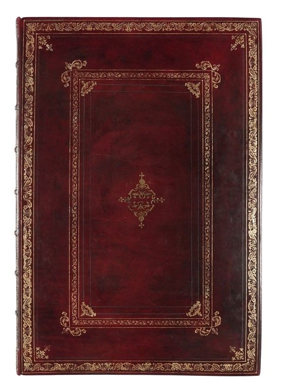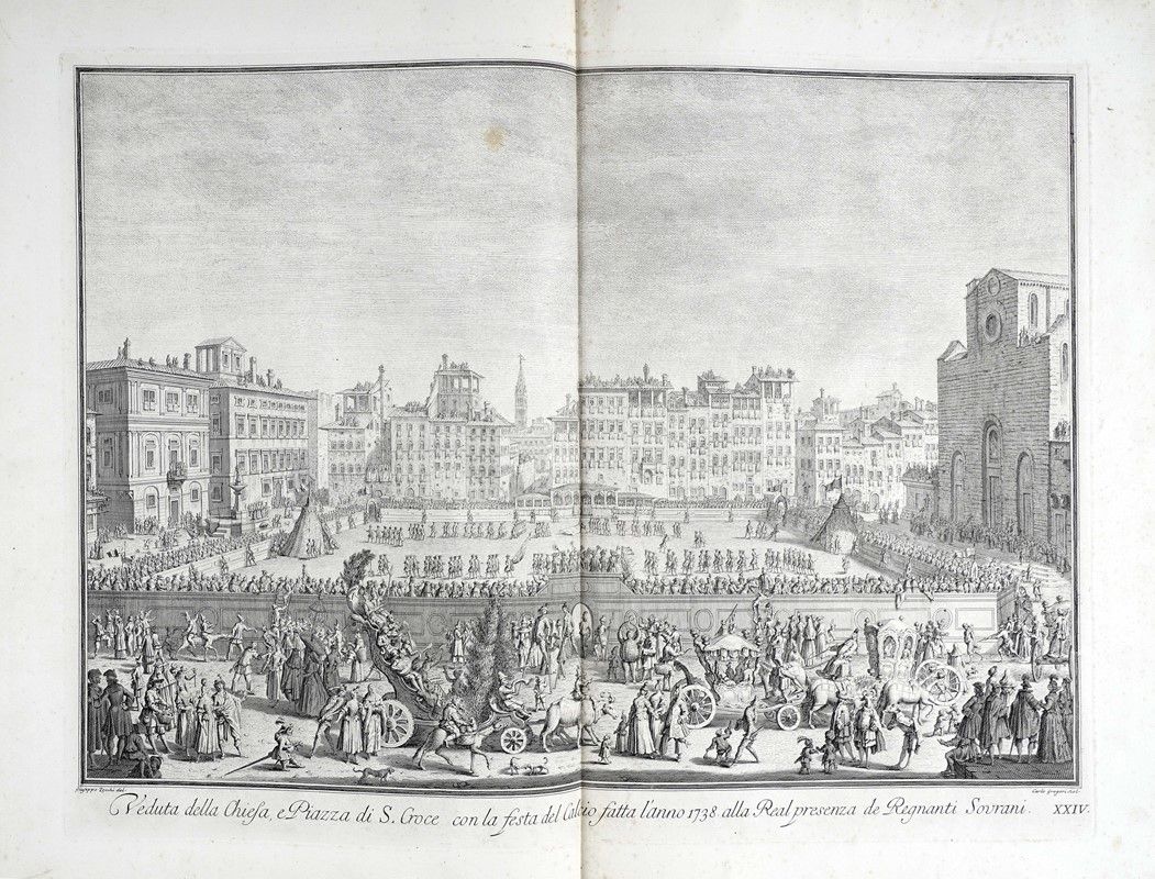 In-folio grande (mm 610x425). II edizione della raccolta commissionata dal Marchese Andrea Gerini comprendente tavole eseguite da alcuni tra i più valenti incisori dell'epoca su disegni di Giuseppe Zocchi, ed edita per la prima volta a cura di Giuseppe Allegrini nel 1744. Frontespizio a doppia pagina con Dedica a Maria Teresa d'Austria incisa da Filippo Morghen, Pianta della città di Firenze nelle sue vere misure...(derivata da quella del 1731 di Ferdinando Ruggeri, con in calce la scritta “Appresso Giuseppe Bouchard in Firenze 1755” e presente solo nella terza edizione pubblicata nel 1757), 24 tavole a doppia pagina incise all'acquaforte con numerazione romana in basso a destra. Bellissima legatura della storica legatoria modenese Apparuti in piena pelle rossa con due cornici concentriche di fregi fitomorfi impresse in oro ai piatti, ferri a motivi fogliati accantonati interni e piccolo rosone centrale; decorazioni, nervature e titoli impressi in oro ai comparti del dorso. Contropiatti con cornice decorata impressa in oro e carta marmorizzata. Al contropiatto posteriore in basso Apparuti Modena. Bellissime impressioni stampate con evidente contrasto e inchiostrazione brillante su carta vergellata pesante.con filigrana lettere P e S visibile sulla quasi totalità dei fogli.