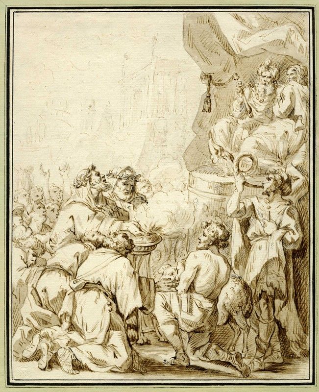 Penna e inchiostro bruno, pennello e acquerello grigio. mm 380x305. Composizione entro cornice decorata ad acquerello verde e filetti a pennello e acquerello nero, in basso la scritta "J. F. de Troy Cab de Spengler n. 598". In basso a sinistra marchio a secco del collezionista danese Benjamin Wolff (Engelholm, Naestvad,1790–1866) (Lugt, 420) e al centro le iniziali "J.C.S." di Johan Conrad Spengler (1767-1839), direttore della galleria e dei dipinti di Copenhagen (Lugt, 1434).