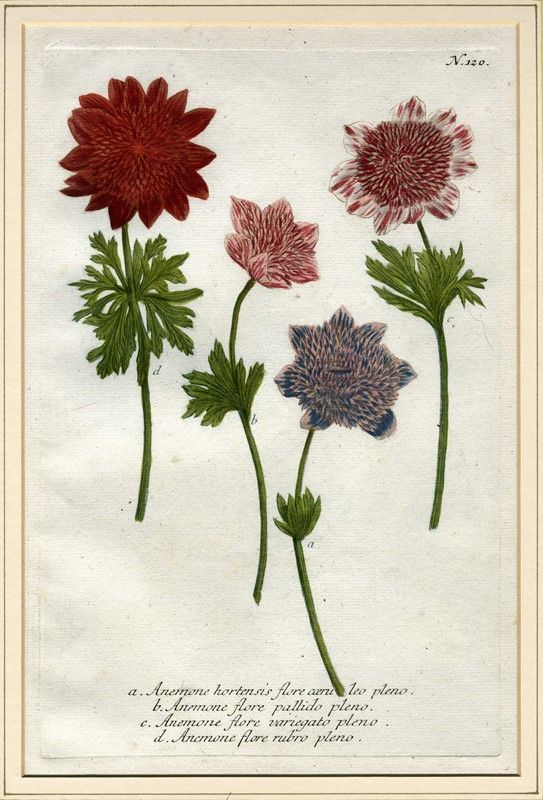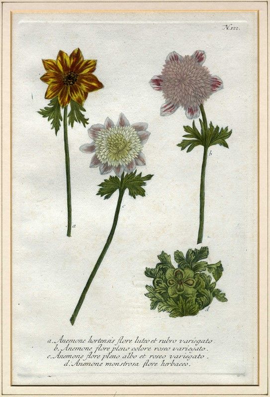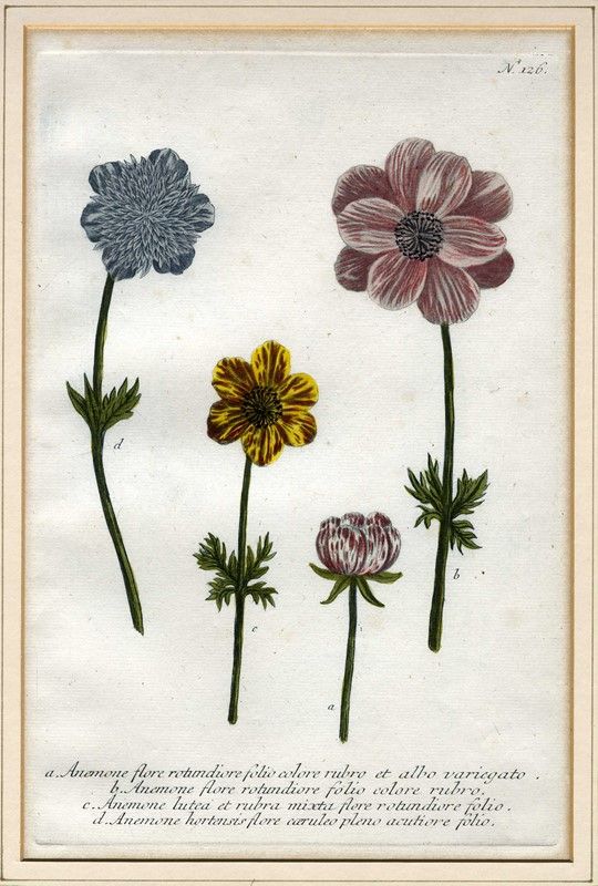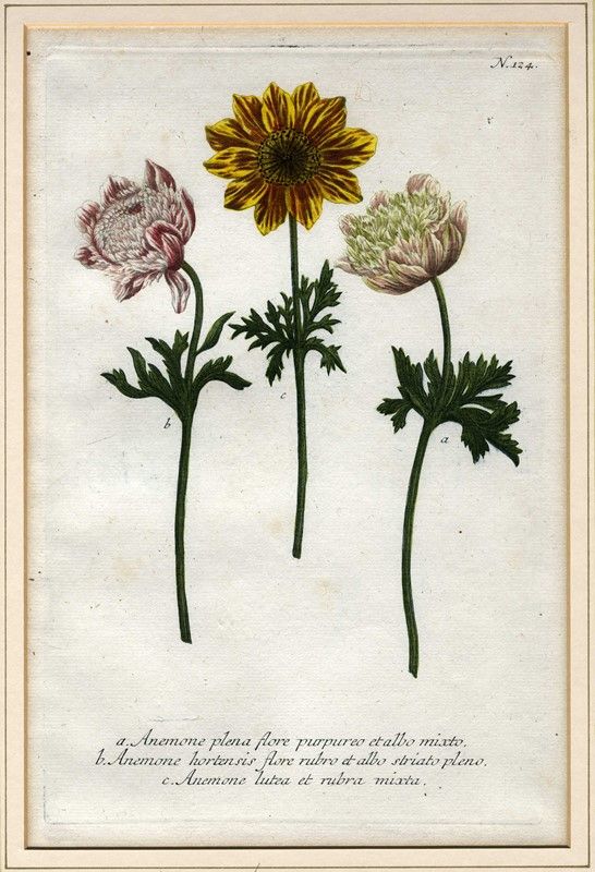 Bulino, mezzotinto, in coloritura. mm 323x210. Foglio: mm 380x240. Sette tavole da Phytanthoza Iconographia (1737-1745), il più importante e prezioso compendio di studi di botanica del XVIII secolo che riporta un migliaio di incisioni, dipinte a mano, di fiori e piante di tutti i continenti. Weinmann produsse la Phytanthoza Iconographia con l’aiuto di alcuni dei più importanti incisori del suo tempo: Bartolomeo Seutter (1678-1754), Johann Ridinger (1698-1766) e Johann Jacob Haid (1704-1767). Il lavoro apparve in più uscite tra 1735 e il 1745; esso fu pubblicato da Seutter, che contribuì a finanziare il progetto, da Ridinger, che si occupò del primo volume, e da Haid, che rielaborò i volumi più tardi. La Phytanthoza Iconographia fu pubblicata con testo in Latino e Tedesco; apparve poi un’edizione olandese pubblicata in quattro volumi nel 1736-1748.
