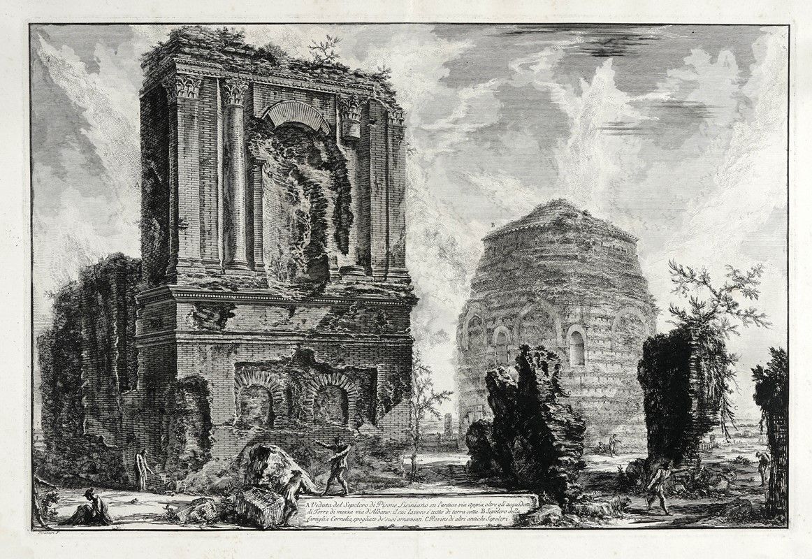 Acquaforte. mm 413x613. Foglio: mm 480x685. Hind, 72. In basso a sinistra "Piranesi F.". Dalle Vedute di Roma, serie in 135 lastre alla quale Piranesi iniziò a lavorare dal 1748 e che continuò ad accrescere con nuove tavole per tutto l’arco della sua vita. Due ulteriori tavole si devono al figlio Francesco. Bellissima impressione nel I stato di 3, avanti la numerazione, stampata con inchiostrazione piena e brillante su carta vergellata con filigrana "fiore di giglio in doppio cerchio sormontato da lettera B" (Robison, 36).