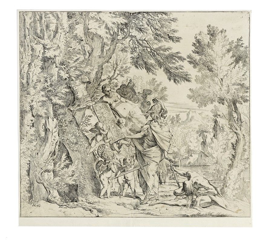 Acquaforte. mm 358x400. Bartsch,XX, 24. Bellini (Testa), 17. Cropper, 59. Ottima impressione priva delle responsabilità indicate al margine inferiore mancante, verosimilmente nel II stato di 2 (indicazione in antica grafia a penna e inchiostro bruno riportata sul supporto al verso) su carta vergellata lievemente spessa. In basso a destra al verso del supporto marchio di collezione non identificato a inchiostro nero con lettere "FT" interlacciate (Lugt, 1045b). SI AGGIUNGE: Id., Id. Acquaforte. mm 394x412. Foglio: mm 415x530. Altro esemplare nello stato definitivo in tiratura tarda su carta calcografica pesante.