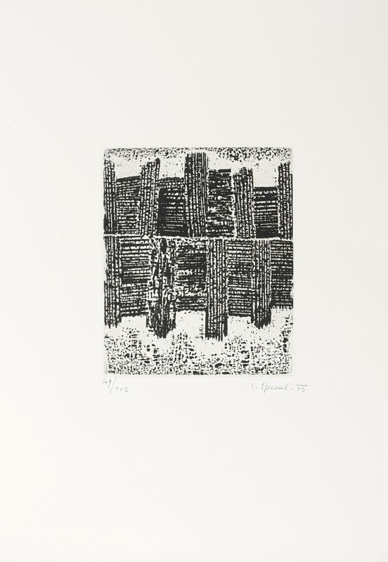 Acquaforte. mm 250x205. Foglio: mm 647x462. Firma e data a matita in basso a destra e tiratura in basso a sinistra. Opera stampata da Il Bisonte, la cui filigrana è presente all'angolo superiore destro. Es. 49/102.