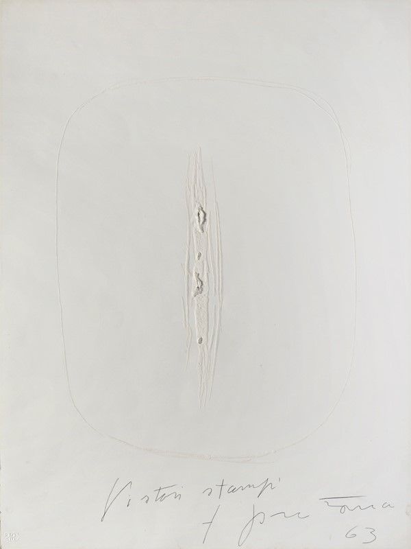 Acquaforte, goffratura e buchi su carta Fabriano. ruhé-rigo, e-19. mm 635x500. Firma, data e "visto si stampi" a matita in basso. Meravigliosa prova di stampa per l'acquaforte che verrà poi co-pubblicata nel 1964 da 2RC, il cui timbro a secco è presente all'angolo inferiore sinistro, e dalla Galleria Malborough di Roma. Accompagnata dal certificato di autenticità di Orler. Questo foglio racchiude in toto il pensiero artistico di Lucio Fontana; dalla presenza dei suoi buchi alla scelta del colore bianco. Così l'artista all'intervento presso la Triennale di Milano nel 1951: "Abbandoniamo la pratica delle forme di arte conosciuta e abbordiamo lo sviluppo di un’arte basata sull’unità del tempo e dello spazio… Concepiamo l’arte come una somma di elementi fisici, colore, suono, movimento, tempo, spazio, concependo un’unità fisico-psichica, colore l’elemento dello spazio, suono l’elemento del tempo, e il movimento che si sviluppa nel tempo e nello spazio. Sono le forme fondamentali dell’arte spaziale.". Sulla scelta del colore bianco, invece, gioca un doppio fattore: è sia un rimando all'assoluta perfezione e purezza, con rimando all'infinito, ed è non-colore o colore assoluto, perchè in realtà riflette tutti gli altri e quindi può diventare qualsiasi colore.