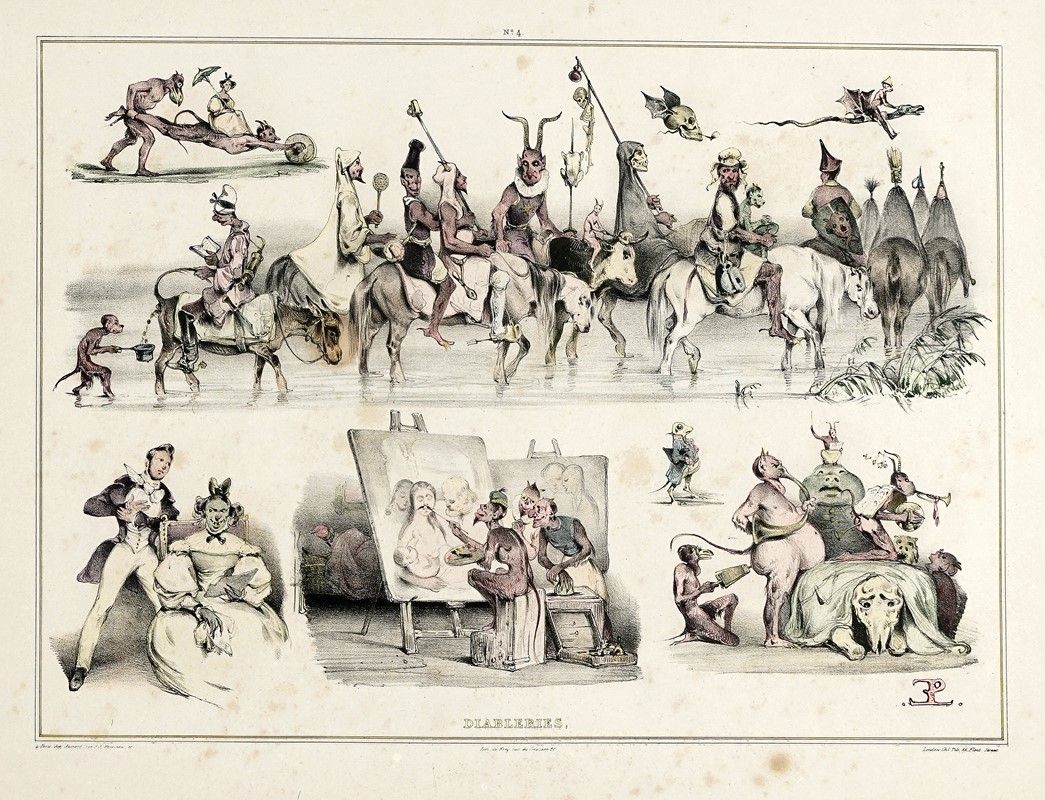Litografia in coloritura coeva ad acquarello. mm 290x400. Foglio: mm 365x550. Tavola n. 4 dall'album Les Diables de Lithographies, Paris / London: Chez Aumont / Charles Tilt, [1832]. Si allega certificato della Galleria Il Mercante di Stampe di Milano. Il foglio proviene dal suddetto album contenente un totale di 14 tavole, ma in bianco e nero, che è di estrema rarità a trovarsi completo. È la più famosa di tutte le opere di Le Poitevin, i cui soggetti diabolici scherzosi hanno stabilito un genere sulla scia delle storie mefistofeleliche e faustiane della scuola romantica. Le diavolerie bizzarre di Le Poitevin con il loro umorismo deliziato dal fascino vivace e accattivante, divennero estremamente popolari tra altri artisti, come Michael Delaporte e Bayalos.