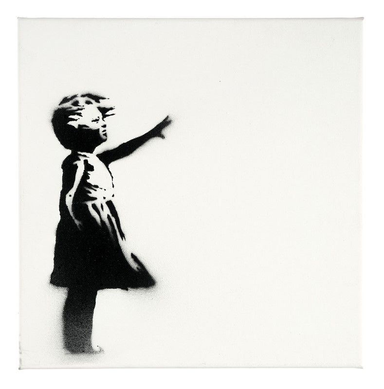 Vernice spray su tele. Dittico. cm 30x30 cad. Firma dell'artista in basso a destra. Al verso di entrambe le tele sono presenti il timbro di Dismaland, l'anno di creazione e la tiratura a pennarello nero. Al verso di una delle due tele è presente la firma, sempre a pennarello nero. Es. 2/5. L'opera è accompagnata dal certificato di autenticità di Rare&Signed con il codice R&SD30361659205 e dal biglietto di ingresso a Dismaland.