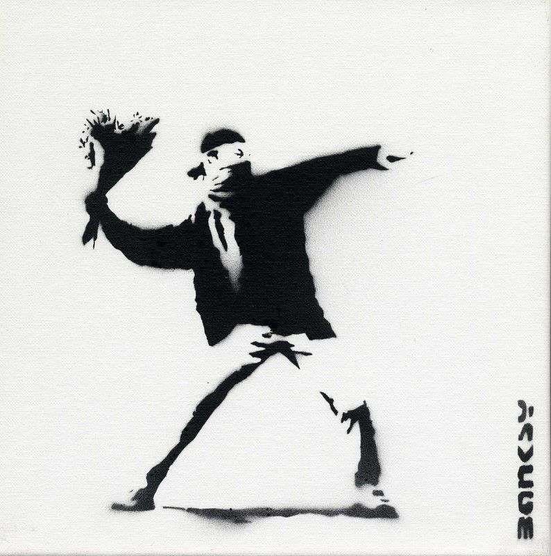 Vernice spray su tela. cm 30x30. Tag dell'artista in basso a destra. Al verso timbro di Dismaland e data e tiratura a pennarello nero. Opera accompagnata dal certifcato di autenticità di Rare&Signed con il codice R&SD30361659207 e dal ticket d'ingresso a Dismaland.