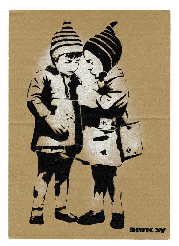 Stencil su cartone. cm 29,7x21. Timbro in basso a destra: "Banksy". Al verso timbro di Dismaland e iscritto: "Enjoy your free art. Banksy is dismal" e tiratura in basso a destra. Accompagnato dal tick d'ingresso a Dismaland, con QR code e codice a barre. Il nome del partecipante è stato cancellato a pennarello per motivi di privacy. Provenienza: Performance di Banksy a Dismaland (agosto/settembre 2015); Collezione milanese.