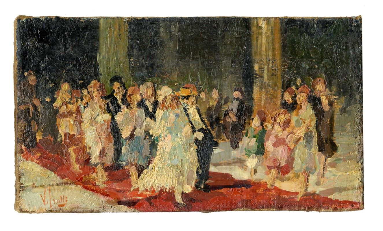 Olio su tela. cm 15,5x27. Firmato in basso a sinistra. Meraviglioso bozzetto preparatorio.