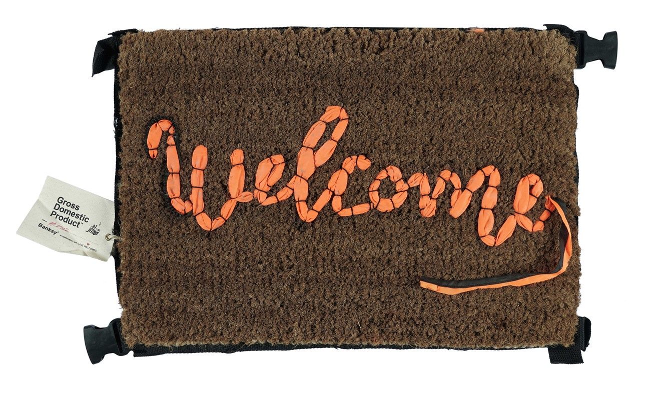 Tappeto ricamato con tessuto dei giubbotti di salvataggio. cm 42x59. Meravigliosa opera di Gross Domestic Product in collaborazione con Love Welcomes e numerato a mano; la numerazione è riportata nella targhetta applicata al bene. L'opera è conservata nella sua scatola originale. Il tappetino è stato cucito con i giubbotti di salvataggio abbandonati sulle coste del Mediterraneo e prodotti in collaborazione con Love Welcomes, che lavora con le donne detenute in Grecia. Tutti i proventi sono utilizzati a livello locale per i rifugiati.