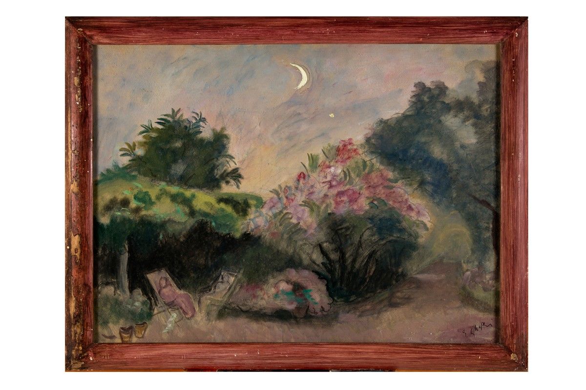 Olio e tempera su cartone. cm 59,5x79 (visibile). Firma a pennarello nero all'angolo inferiore destro. Etichetta recante artista, titolo e dimensione applicata al verso. Proveniente dalla collezione Serafini.