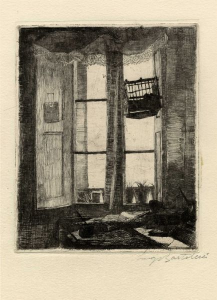 Acquaforte su carta Cina applicata a carta pesante. mm 199x158. Foglio: mm 475x335. ESEMPLARI UNICI E RARI, 13; MARINO, 203; FICACCI, 78. Esemplare nel I stato su 2 prima del rinforzo delle ombre e dei tratti sull’imposta di sinistra e l’aggiunta della firma. Titolata in lastra "Il Compagno" in basso a destra. Firmata a matita in basso a destra. Timbro a secco con nome dell'Artista in basso a destra. Etichetta contenente titolo e numero di taratura all'angolo superiore sinistro del verso. Es. 21/25.