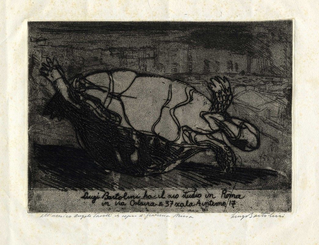 Acquaforte e acquatinta su velina applicata. mm 155x209. Foglio: mm 293x378. MARINO, 763. Iscritto: "Luigi Bartolini ha il suo studio in Roma in via Oslavia n 37 scala A interno 17" in lastra al margine inferiore. Firmata a matita in basso a destra e dedicata all'amico Angelo Savelli a matita in basso a sinistra. Timbro a secco dell'artista all'angolo inferiore destro.