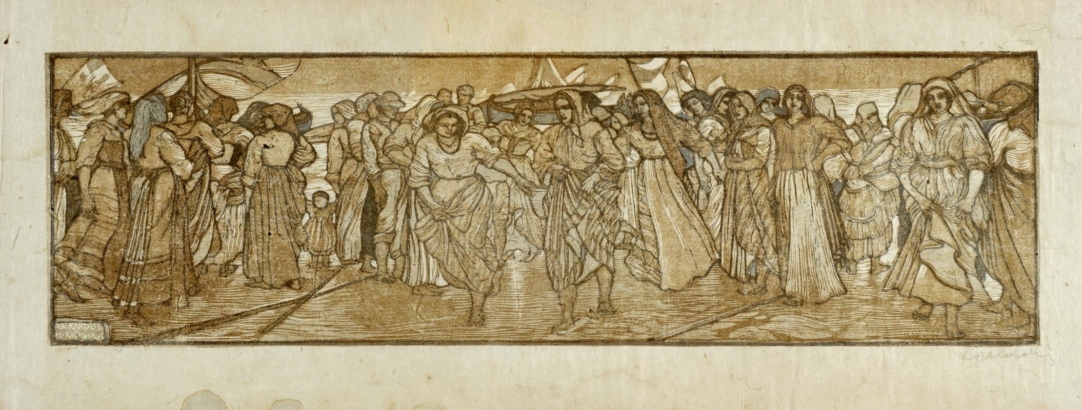 Xilografia a quattro legni. mm 140x475. Foglio: mm 205x530. Amadio/Papetti, 60-61. Conti, 50. In basso a sinistra, sul legno: «A. De Carolis / Del. Scul. Excud.». Prova d'artista firmata a matita in basso a destra. L’incisione fa parte del gruppo di xilografie dedicate ai pescatori del mare Adriatico, per realizzare le quali l’artista eseguì anche numerose fotografie dal vero. Bella impressione su carta Japon in beige, avana, marrone e grigio-blu.