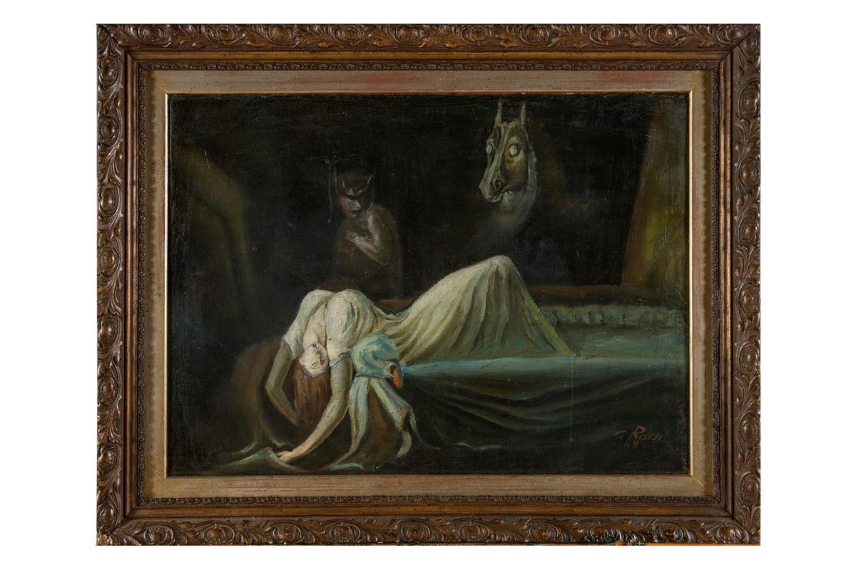 Olio su tela. cm 45x61. Firmato e datato in basso a destra. Libera interpretazione, bizzarra e quasi proto-espressionista, del celebre dipinto L'incubo di Johann Heinrich Füssli. Non ci è dato sapere se l'autore possa essere identificato con il pittore e scenografo Giuseppe Rossi (Perugia 1820-1899) di cui sono note soprattutto le vedute della città natale destinate ai viaggiatori.