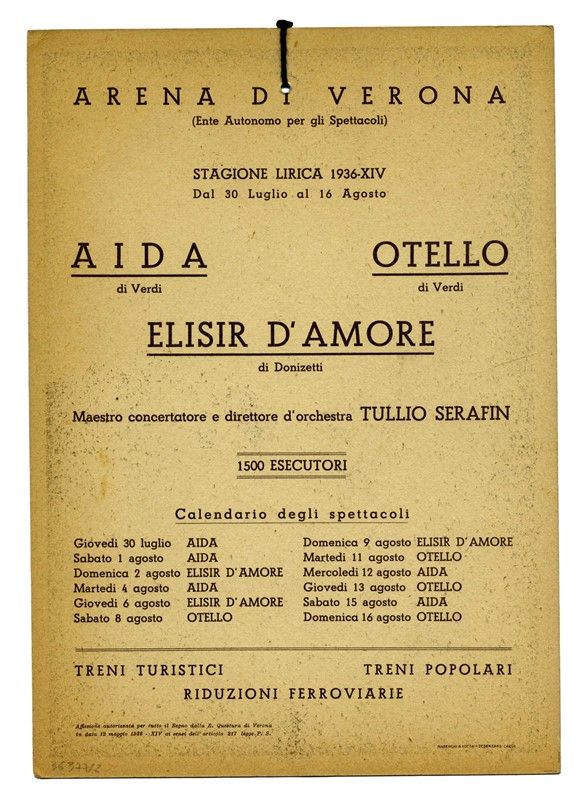 1) Disegno preparatorio per l'Arena di Verona. 1936. Matita e pastelli colorati su carta. mm 185x116. Firmato al margine destro. 2) Aida, Elisir D'Amore, Otello. Litografia a colori. mm 232x160. Foglio: mm 246x175. Firmato in lastra all'angolo superiore sinistro. Programmazione della stagione incisa in litografia al verso. Le opere previste in questo anno teatrale sono l'Aida e l'Otello di Verdi, chiudendo il programma l'Elisir D'Amore di Donizetti.