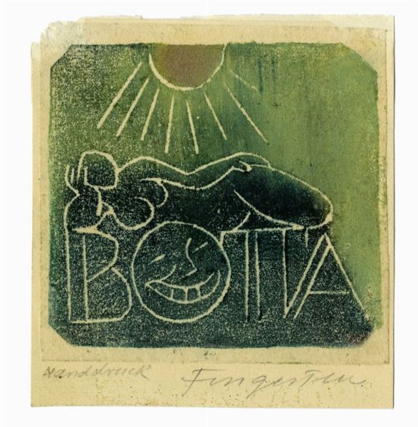 1) [Ex libris Giovanni] Botta. 1942. Linoleografia. mm 80x90. Foglio: mm 108x100. MICHEL FINGESTEN EXLIBRISKUNST. N 101. Firma a matita in basso a destra, iscritto: "Handdruck" a matita in basso a sinistra. 2) Auguri. 1943. Linoleografia. mm 85x115. Foglio: mm 92x118. Firma a matita in basso a destra, iscritto: "Handdruck" a matita in basso a sinistra. Opere realizzate negli ultimi anni di vita dell'artista.