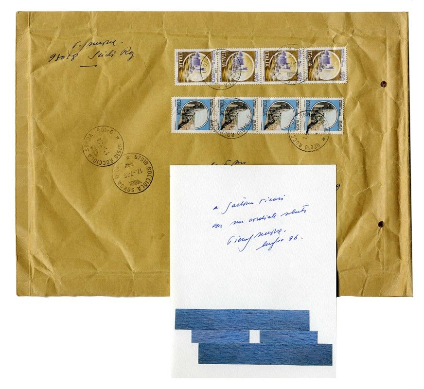 Raccolta di 3 piccoli collage di augurio da artisti vari. mm 100/260x115/172. Risposte di auguri e ringraziamenti per Gaetano Vicari da Gualtieri Nativi, Piero Guccione e Christo Javachev, ognuno dei quali ha allegato insieme al messaggio una piccola opera a base stampa con collage applicato. Le opere sono accompagnate da involucri viaggiati.