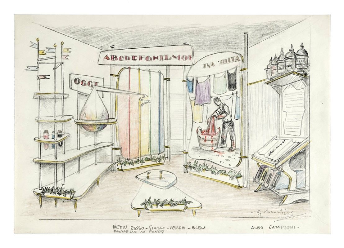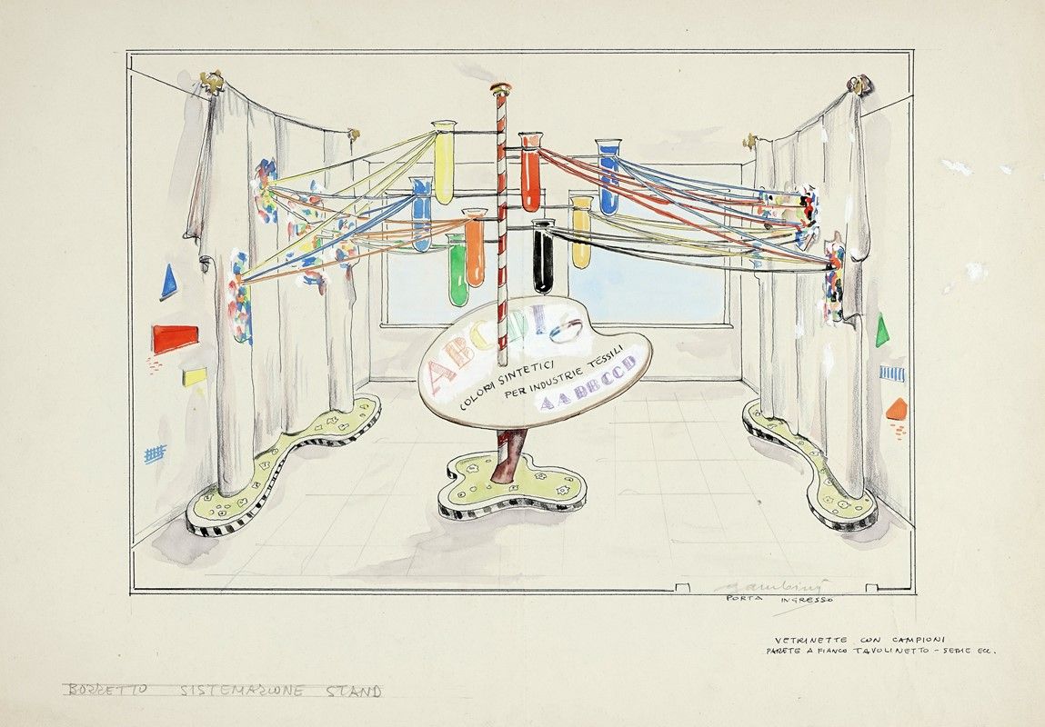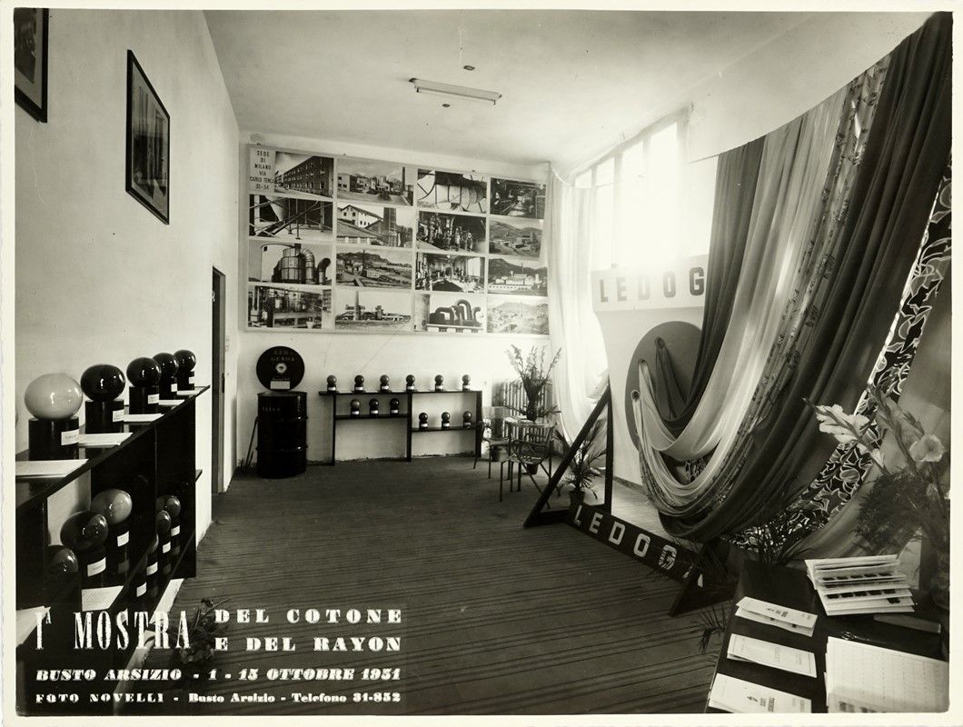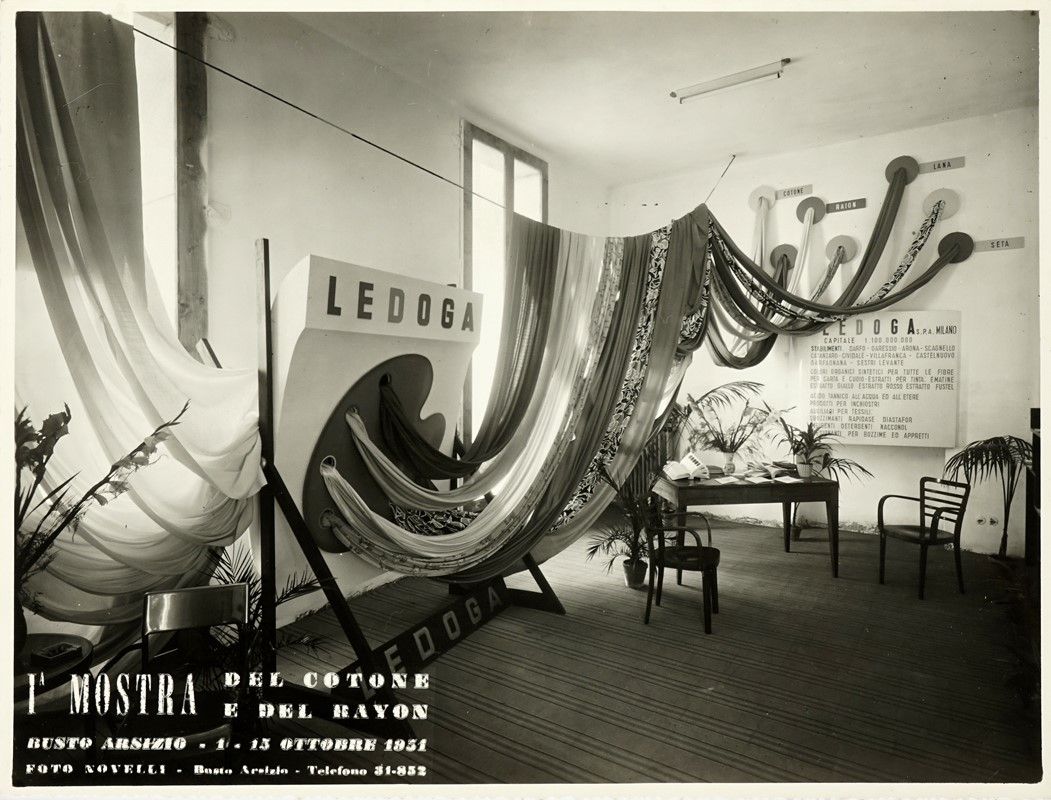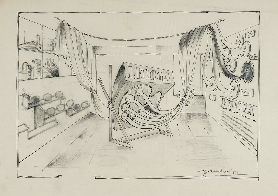 1) Raccolta di 3 bozzetti progettuali. Matita, pastello colorato, penna e inchiostro di china nero, carboncino e acquerello su carta. mm 340/345x480/495. Tutte firmate a matita in basso a destra. Dettagli dispositivi progettuali a matita o penna e inchiostro di china nero al margine inferiore di ogni foglio. 2) Bozzetto preparatorio. 1951. Carboncino e penna e inchiostro di china nero su carta lucida. mm 295x415. Firmato e datato a matita in basso a destra. 3) Stand Ledoga. Coppia di fotografie in bianco e nero. 1951. mm 175x235 ciascuna. Tutte le opere, specialmente il materiale fotografico, sono documenti a testimonianza dello stand di Ledoga s.p.a. per la prima Fiera del cotone e del rayon tenuta nel 1951 a Busto Arsizio. Gli anni '50 per l'Italia sono stati uno spartiacque per l'industria tessile: da una parte la sempre più crescente presenza sul mercato delle nuove fibre sintetiche, economiche e durevoli rivoluzionavano l'abbigliamento e la filiera produttiva; dall'altra la difficoltà italiana nello stare al passo con i tempi e nel modernizzare la propria produzione da sempre incentrata sulle fibre naturali. Il Nord Italia, iconico distretto della fibra pettinata cotoniera, organizza così una fiera per attirare nuovi clienti esteri. Ebbe un successo eclatante: a costruire i padiglioni espositivi spiccano giganti dell'architettura come Enrico Castiglioni, Carlo Fontana e Luigi Crespi.