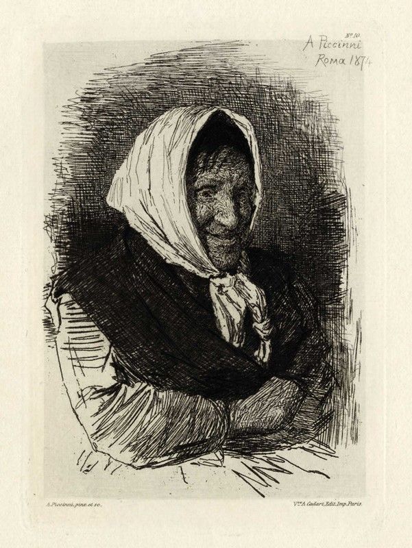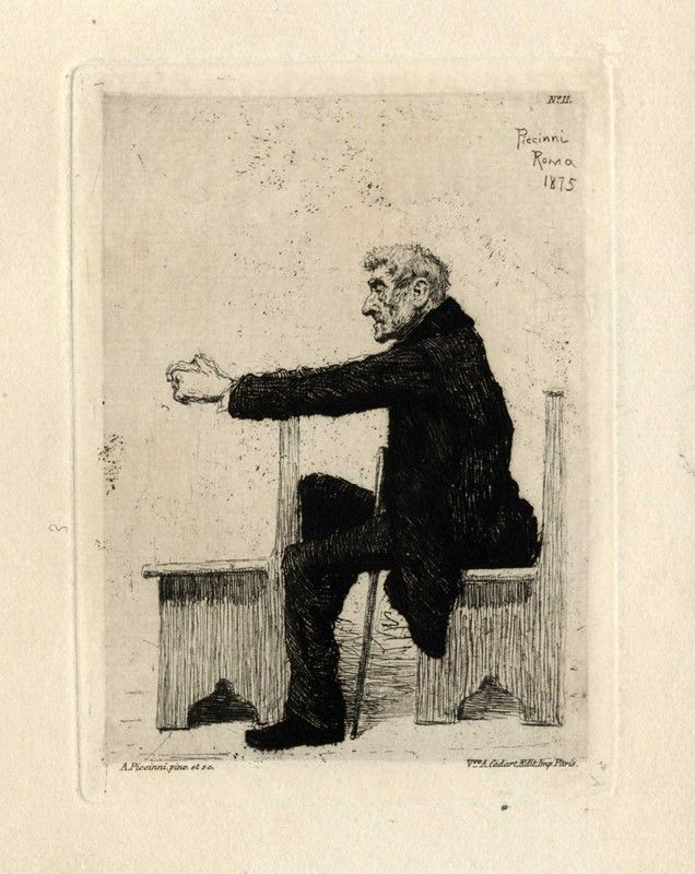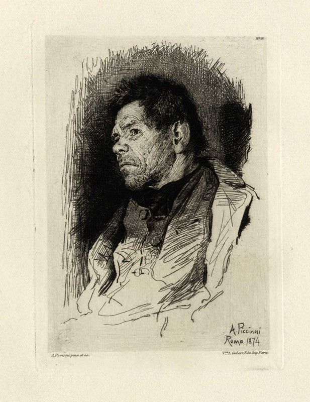 1) Ritratto di anziana. 1874. Acquaforte su carta vergellata. mm 145x105. Foglio: mm 211x161. Firma, luogo ed iscritto "Roma" in lastra all'angolo superiore, dati editoriali al margine inferiore della lastra. 2) Ritratto. 1874. Acquaforte su carta vergellata. mm 147x100. Foglio: mm 222x200. Firma, data ed iscritto "Roma" in lastra all'angolo inferiore destro, siglato in lastra all'angolo inferiore sinistro. Dati editoriali in lastra al margine inferiore. 3) Devoti in preghiera, 1875. Acquaforte su carta vergellata. mm 130x170. Foglio: mm 165x225. Firma, data ed iscritto "Roma" in lastra all'angolo superiore sinistro. Dati editoriali in lastra al margine inferiore. 4) Vecchio seduto. 1875. Acquaforte su carta vergellata. mm 125x90. Foglio: mm 193x155. Firma, data ed iscritto "Roma" all'angolo superiore destro. Dati editoriali in lastra al margine inferiore. Opere provenienti da una ristampa parigina tra il 1878 ed il 1880. L'incisore prediligeva ritrarre i momenti più quotidiani della vita di paese, concentrandosi sui piccoli gesti e le espressioni dei soggetti ritratti. Compongono il lotto le tavole n. 8,9,10 e 11 indicate al margine superiore di ogni lastra.