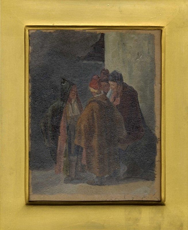 Olio su carta spessa. cm 16,5x13,5. Indicazione di provenienza ed acquisto iscritti a penna a sfera blu al verso del cartoncino di supporto posteriore. Opera non firmata, come spesso succedeva nella realizzazione di bozzetti simili dell'artista.