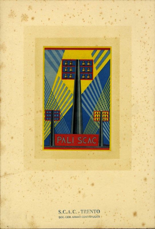 Miniaturizzazione di un manifesto del 1940. Firma in lastra in basso a destra. Foglio applicato a foglio di sostegno marchiato S.C.A.C-Trento Soc. Cem. Armati Centrifugati in basso al centro.