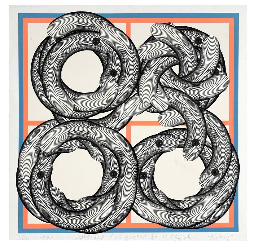 Serigrafia colori con cerchi cinetici a sbalzo. mm 460x460. Foglio: mm 500x500. Firmata, datata e numerata a matita al margine inferiore. Titolata "Serigrafia mobile con 4 cerchi" in serbo-croato a matita al margine inferiore. Iscritto: "Sutej 17" a matita al verso. I cerchi, anch'essi serigrafati, riescono a ruotare sull'opera con dei perni inseriti nella carta e coperti da feltro nero al verso. Opera accompagnata da certificato di autenticità della Galleria Marino di Roma. Es. 5/40.