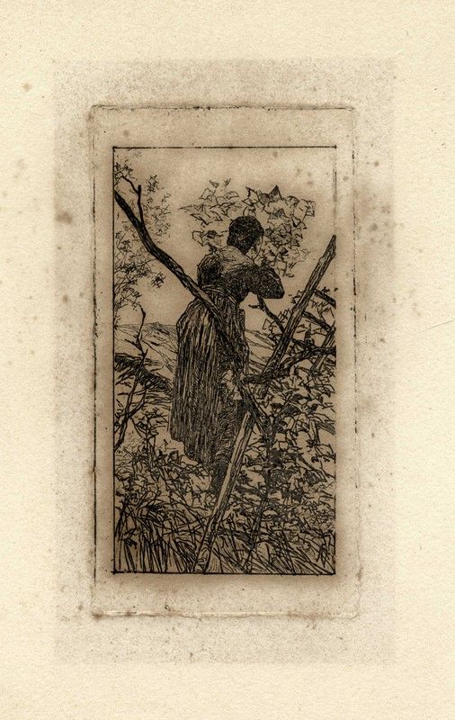 Acquaforte su zinco. mm 196x101. Foglio: mm 365x273. baboni-malesci, LXVI. Meraviglioso esemplare in tiratura coeva, conosciuto anche con il titolo La potatrice (ghiglia, XLII). Questa acquaforte fa parte delle 21 che la G.A.A.M di Roma acquistò il 3 settembre 1888 dalla Calcografia Nazionale per cui è databile agli anni precedenti. Essa è riferibile, con lievi variazioni compositive, al disegno a penna Raccoglitrice di foglie e Paesaggio, esposto ad Amsterdam nel 1969 ed ai due dipinti Tre impressioni e La pulitura delle viti. Rara.
