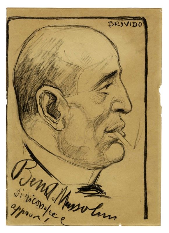 Matita e carboncino su carta. mm 307x220. Firmato all'angolo superiore destro. Iscritto: "Benito Mussolini si riconosce e approva!" in basso a sinistra.