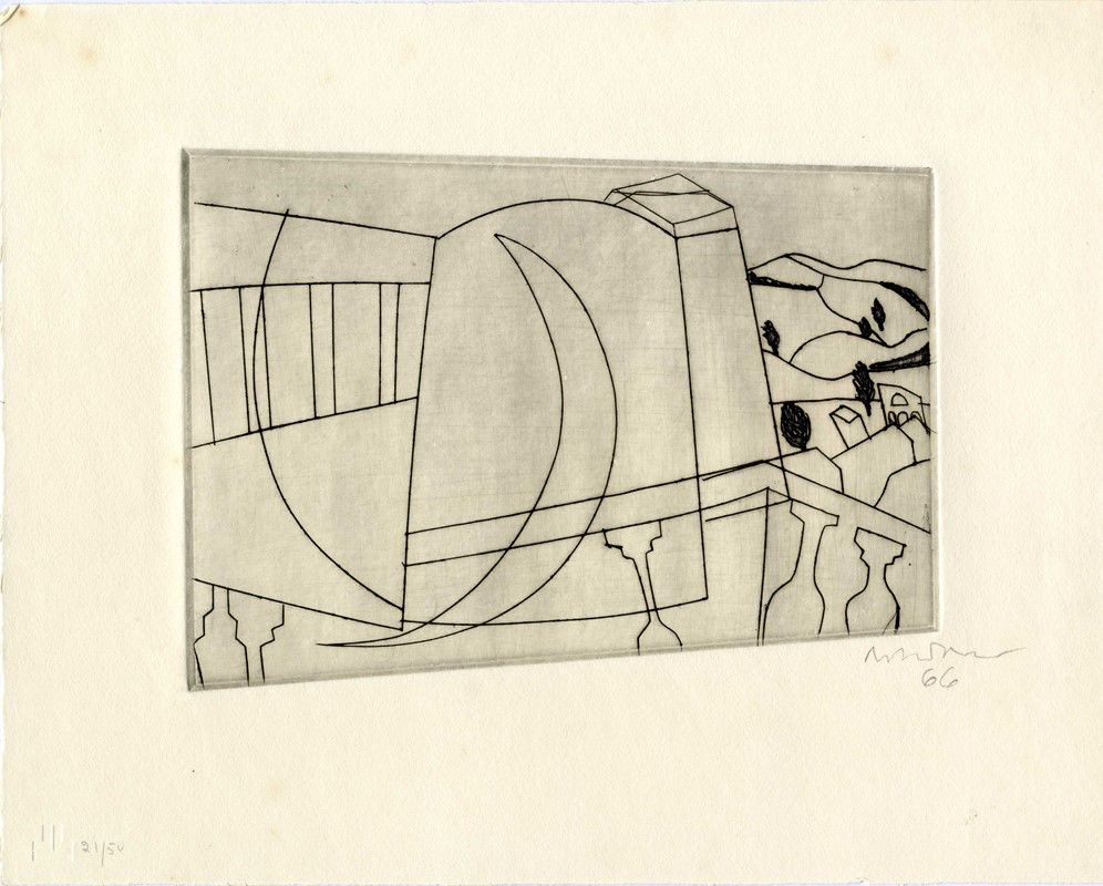 Acquatinta. mm 144/170x235 (lastra irregolare in altezza). Foglio: mm 278x350. lafranca, 38. Firma e data a matita in basso a destra, tiratura e timbro a secco in basso a sinistra. Es. 21/50. Rara.