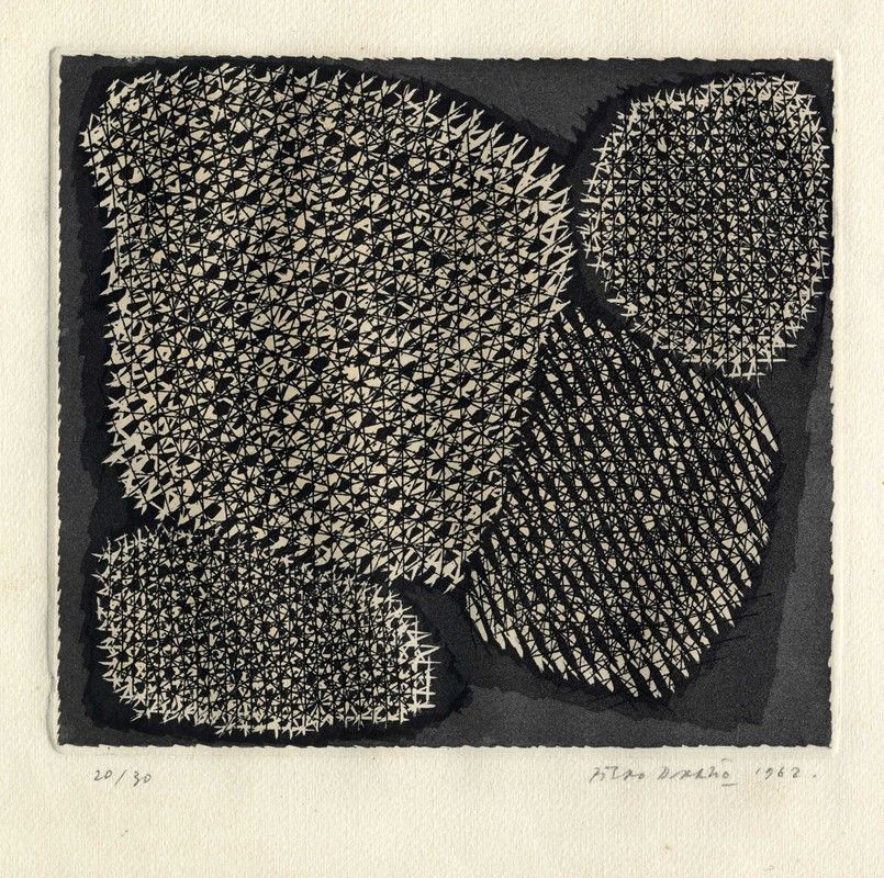 Acquatinta. mm 200x220. Foglio: mm 348x447. Firmata e datata a matita in basso a destra, numero di tiratura a matita in basso a sinistra. Timbro a secco al margine inferiore sinistro. L'opera presenta una inchiostrazione ancora viva e materica. Es. 20/30.