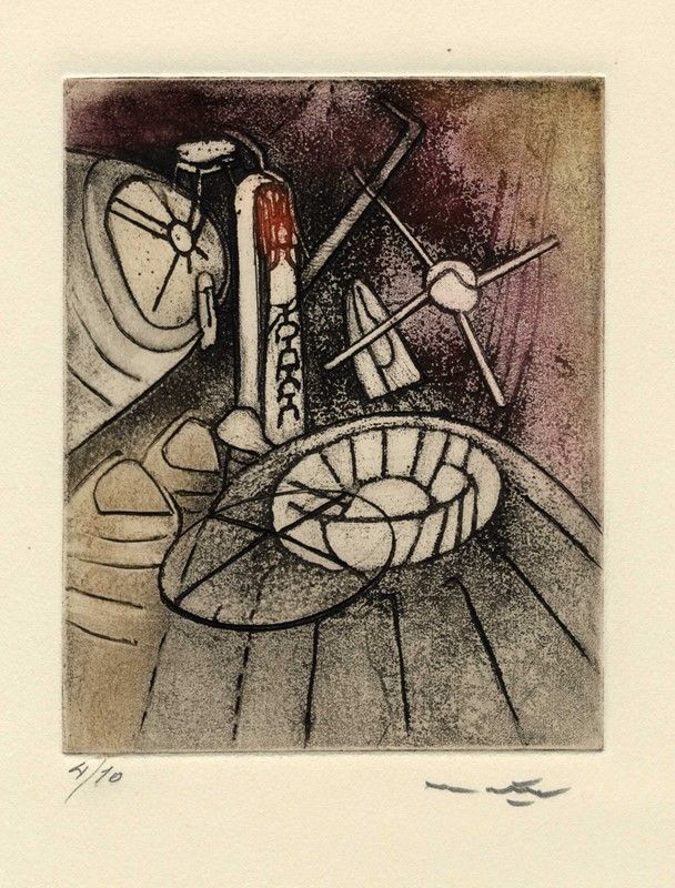 Acquaforte e acquatinta a colori. mm 160x130. Foglio: mm 450x320. Firmata a matita in basso a destra, numerata a matita in basso a sinistra. Impressione perfetta ed inchiostrazione ancora viva e materica. Es. 4/10.