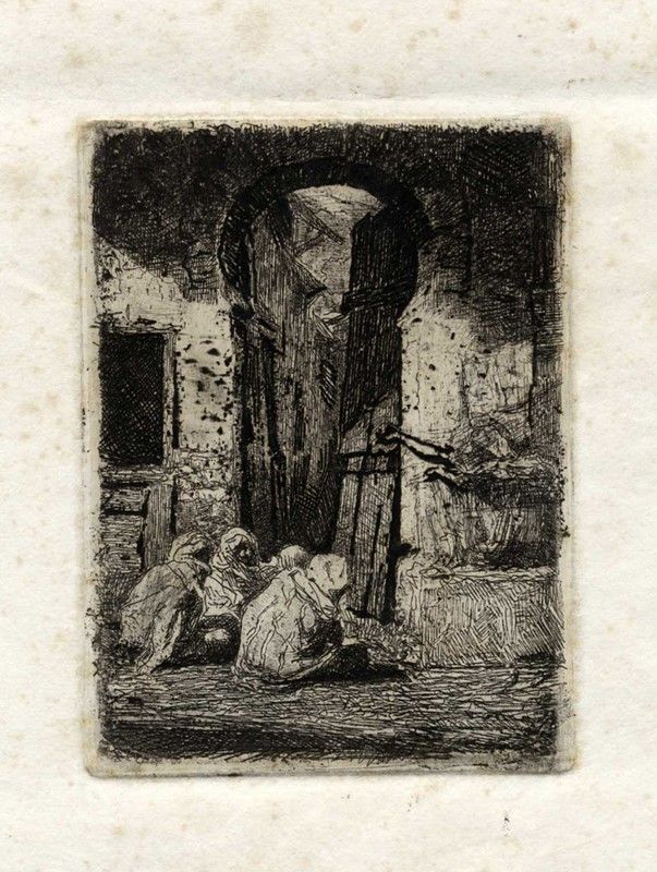 Acquaforte. mm 95x71. Foglio: mm 240x170. Vives i Pique/Cuenca Garcia, 17. Esemplare in prima tiratura privo di iscrizioni e con varianti. In particolare è completamente tracciato e visibile il braccio proteso dell'arabo seduto a destra. Annotato a penna sul retro: "4a ac. P. 3. con varianti dalla 1a M. Fortuny. Sta in Roma" probabilmente di mano dell'autore stesso. Pertanto la data (?) "83" apposta in piccolo a seguire sarebbe da ritenersi di altra mano e aggiunta successivamente. Si ritiene quindi trattarsi di una rarissima prova di stampa forse unica.