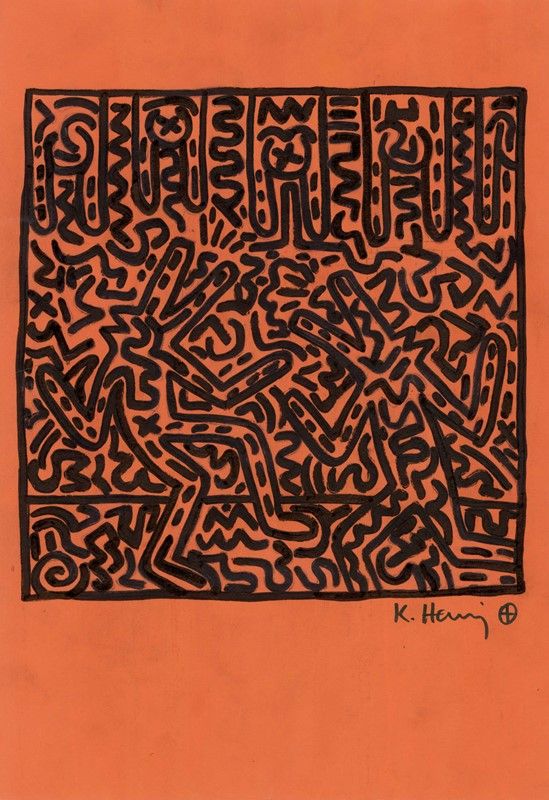 Tempera su carta. cm 29,5x20,5. Firma in basso a destra a pennarello nero. Al verso timbro del certificato di autenticità del Keith Haring Estate a inchiostro nero con firma di Julia Gruen e data del rilascio dell'autentica, cioè 09/08/90, a penna a sfera nera. In basso a destra ulteriore timbro a inchiostro nero: "Authorized by the Estate of Keith Haring". L'opera è accompagnata dal certificato di autenticità di Rare&Signed con il codice: R&SD30349207282778902 e dalla perizia calligrafica sulla firma dell'artista. Il cane che cammina su due zampe è una versione mitica e generalizzata di una persona, ma anche un richiamo ad Anubi; i cani che ballano si riferiscono a performance artistiche o alla breakdance, espressioni dell'energia vitale che caratterizza l'operato artistico di Haring.
