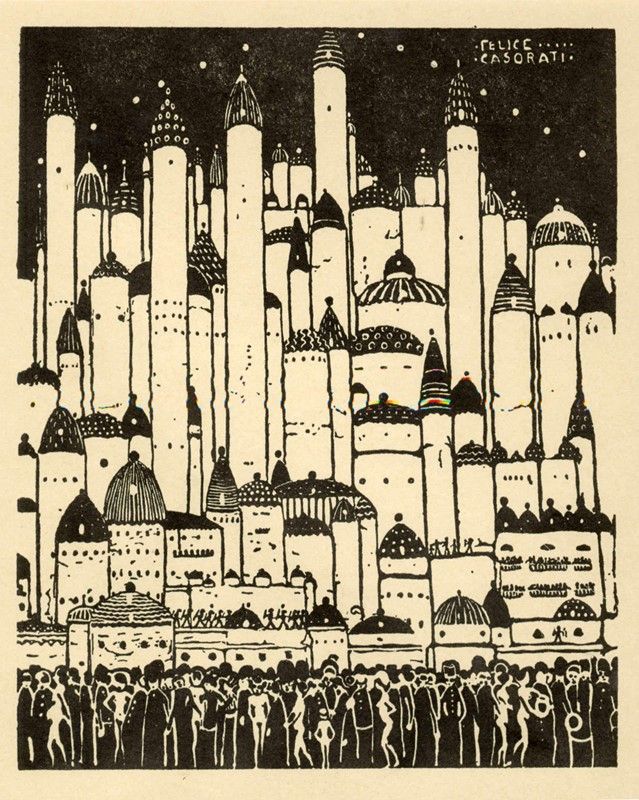 Xilografia. mm 178x150. Foglio: mm 195x165 (visibili). Firmata nella matrice in alto a destra. Firmata nella matrice in alto a destra. Rara prova di stampa in nero di una xilografia pubblicata nel fascicolo dei secessionisti de L'Eroica nel 1915 (impressa in rosso) e ne La via lattea nel 1914. Pur essendo comunemente descritta come xilografia, potrebbe in realtà trattarsi di una zincografia adatta al formato della rivista, essendo la versione ridotta di una introvabile xilografia di dimensioni più grandi, di cui l'unica copia a noi nota è conservata presso l'archivio del museo Casorati a Pavarolo.