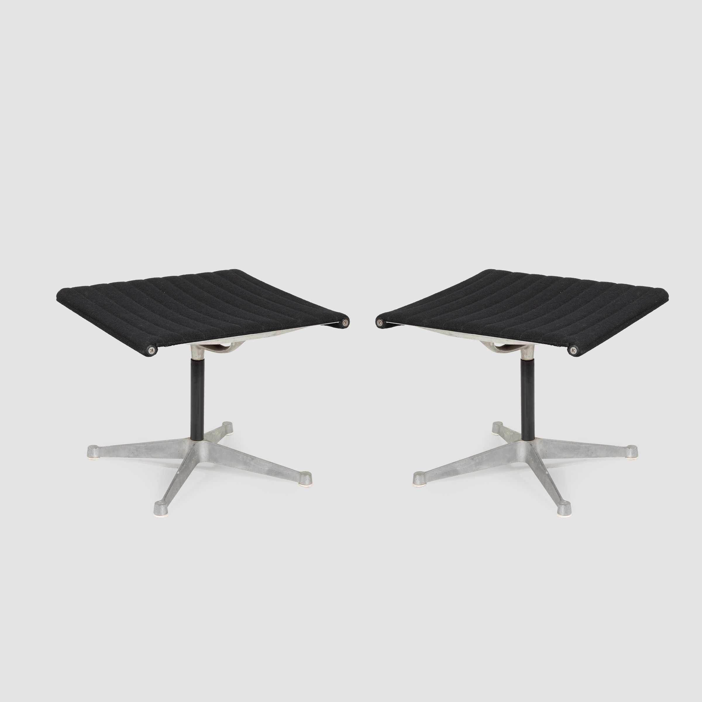 Stati Uniti, anni 60 coppia di poggiapiedi mod. EA 125 in acciaio e tessuto imbottito, etichetta della produzione