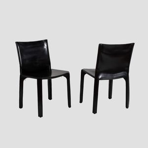 81x52x49 cm. Italia, anni 70 quattro sedie mod. CAB 412 in cuoio nero e acciaio, etichetta della produzione, [..]