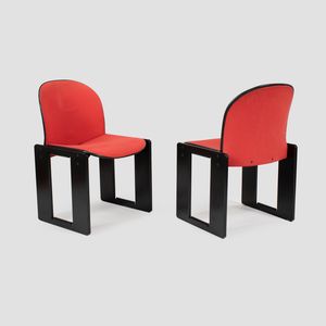 79,5x46x52 cm. Italia, 1974 quattro sedie mod. Dialogo in legno dipinto e tessuto imbottito, lievi usure. Bibliografia: [..]