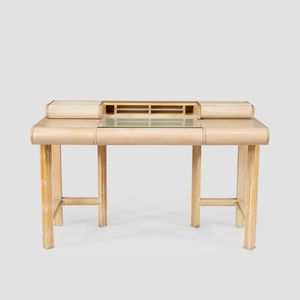 82x125x63 cm. anni 70 scrivania in legno, vetro e pelle, lievi difetti