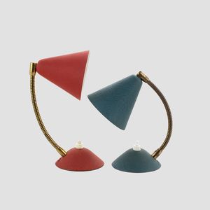 h. massima 25 cm. anni 50 coppia di lampade da tavolo orientabili in ottone e metallo verniciato, usure