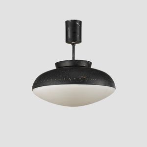 d. 30 cm. anni 50-60 lampada a sospensione in ottone, metallo verniciato e vetro satinato, usure