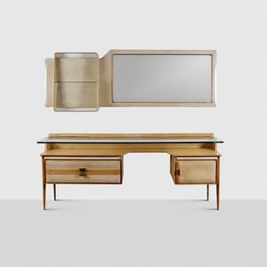 77x197x44 cm. - 70x193x15 cm. Italia, anni 50 mobile cassettiera con specchiera in legno, pergamena, vetro e [..]