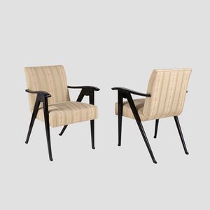 90x64x60 cm. Italia, anni 50 coppia di poltrone in legno e tessuto imbottito
