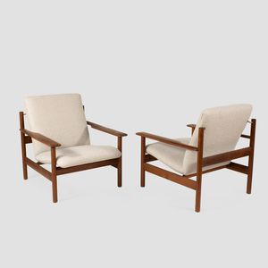 78x71x80 cm. Norvegia, anni 60 coppia di poltrone in legno, metallo e tessuto imbottito