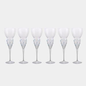 h. 22 cm. Italia, anni 90 sei bicchieri in vetro trasparente e colorato, firma a punta, entro scatola origina [..]