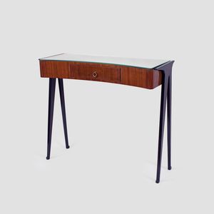90x105x38,5 cm. anni 40-50 console in legno, ottone e vetro specchiato